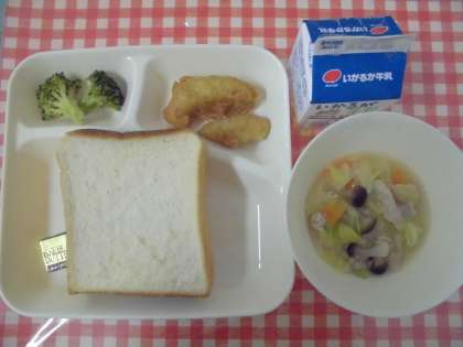 【食パン、バター、白身魚のフリッター、洋風煮、ブロッコリーのサラダ、牛乳】