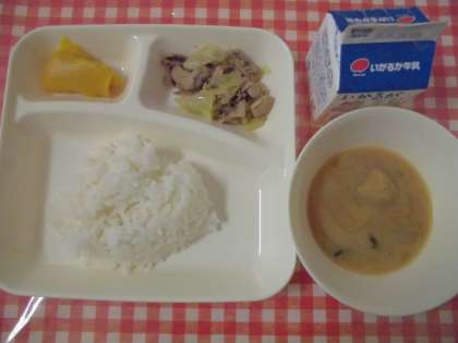 【ごはん、豚肉とまいたけのいためもの、つみれ汁、かぼちゃういろう、牛乳】