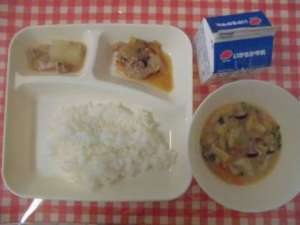 【ごはん、鶏肉の甘辛焼き、みそ汁、だいこんの煮もの、牛乳】