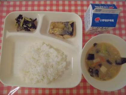 【ごはん、さばのみぞれかけ、みそ汁、小松菜の煮びたし、牛乳】