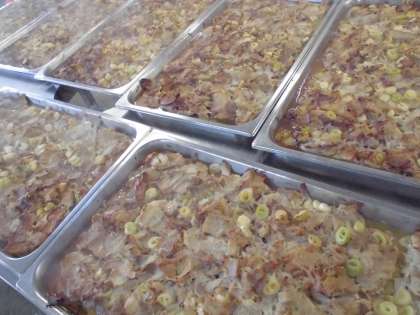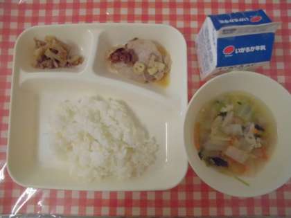 【ごはん、豚肉のねぎじょうゆ焼き、すまし汁、れんこんのおかかいため、牛乳】