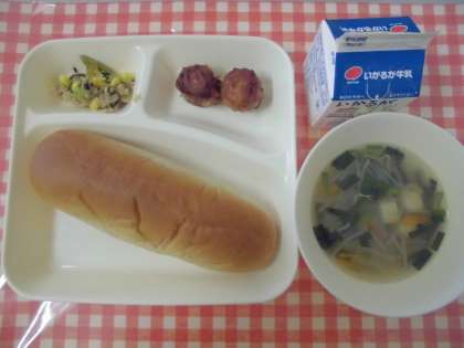【黒糖パン、あげシューマイ、とうふのスープ、ツナとチンゲンサイのいためもの、牛乳】