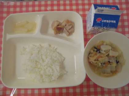 【ごはん、鶏肉のしょうゆマヨネーズ焼き、五目汁、かぶのゆず風味、牛乳】
