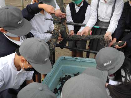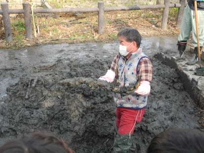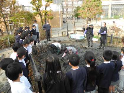 12月23日(水)、地域のみなさんの協力を得て、れんこんを掘りました。すくすくの森にある「蓮池」を特別な道具で掘り起こしていきます。大きな連なるレンコンが掘り起こされると、見学にきた2年生から大きな歓声があがりました。