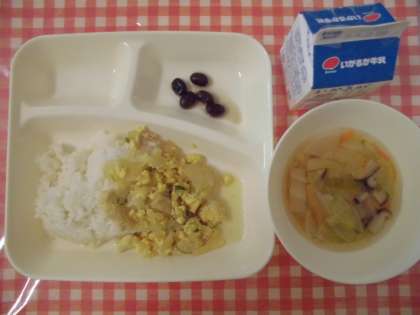 【親子丼、すまし汁、黒豆の煮もの、牛乳】