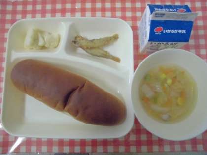 【黒糖パン、わかさぎフライ、はくさいのスープ、カリフラワーのサラダ、牛乳】