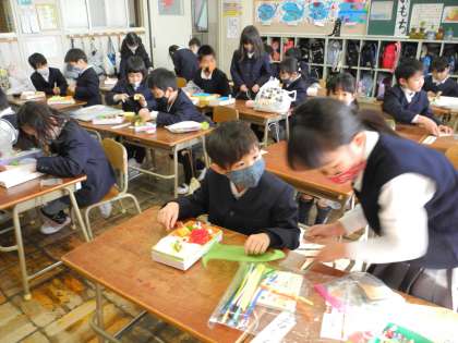 友だちの作った作品を見て、いいところを取り入れたり、お弁当箱に模様を描いて工夫したりしてオリジナルの素敵なお弁当が完成させました。