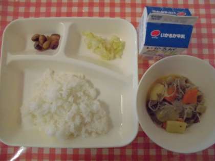 【ごはん、肉じゃが、はくさいのゆず風味、とら豆の煮もの、牛乳】