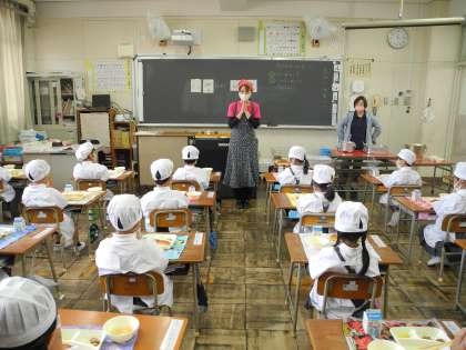 1年生は、給食着に着替えて身支度をして、静かに待っていました。