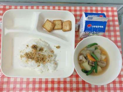 【鶏肉とじゃがいもの煮もの、あつあげのしょうゆだれかけ、紅ざけそぼろ、ごはん、牛乳】