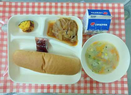 【煮こみハンバーグ、コーンスープ、焼きかぼちゃ、コッペパン、いちごジャム、牛乳】