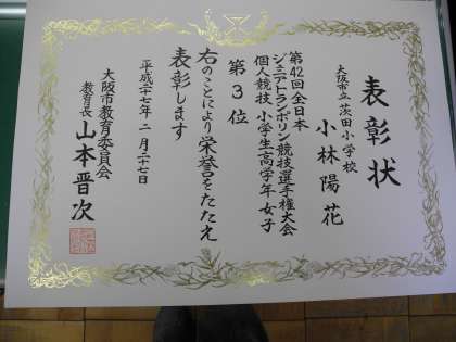 5年の小林陽花(こばやし ひより)さんが、この度トランポリンで立派な成績をあげたことにより、教育長表彰を受けました。