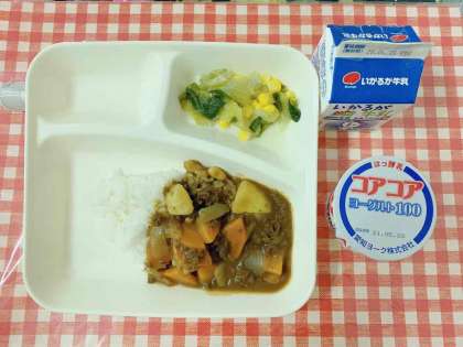 【牛肉と大豆のカレーライス、レタスとコーンのサラダ、ヨーグルト、牛乳】