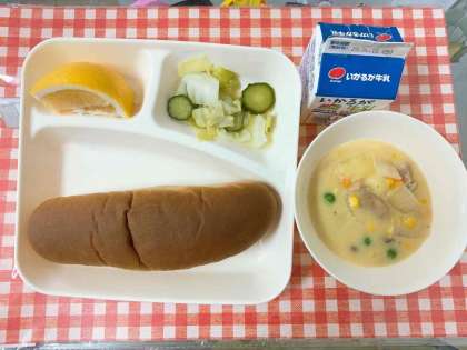 【コーンクリームシチュー、キャベツときゅうりのサラダ、