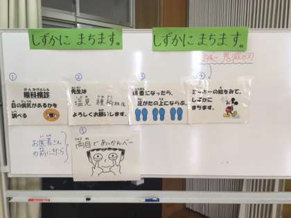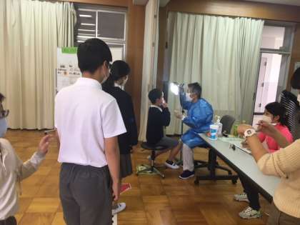 感染症予防のために校医さんがなるべく児童に触れないよう、児童が自分で、両目の「あっかんべー」をして校医さんに眼を診てもらいました。