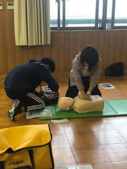 AEDが到着するまで、1分間に100回の早いテンポで連続して絶え間なく胸骨圧迫を行いました。
