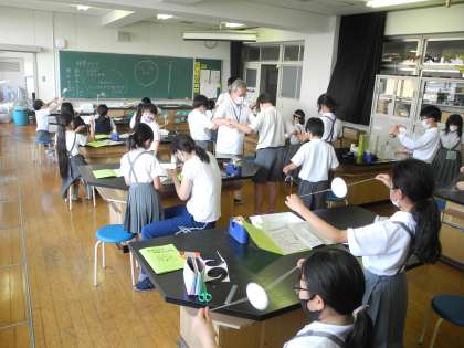 初めての活動では「ぶんぶんゴマ」を作りました。4年〜6年生みんなで協力し、一生懸命取り組んでいました。