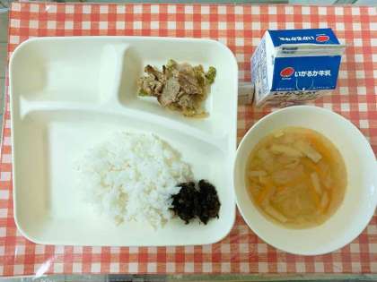 【豚肉のごまみそ焼き、すまし汁、のりのつくだ煮、ごはん、牛乳】