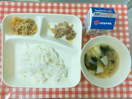 【豚肉の甘辛焼き、すまし汁、切り干しだいこんのいため煮、ごはん、牛乳】