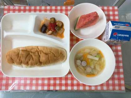 【鶏肉と夏野菜のソテー、押麦のスープ、すいか、おさつパン、牛乳】