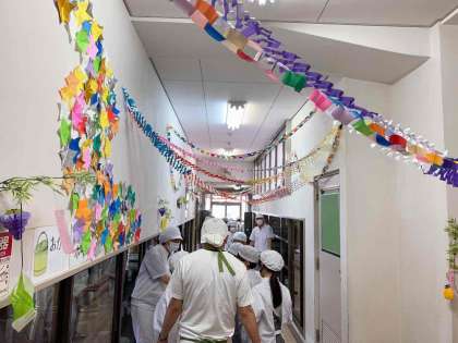 明日のたなばたに向けて、調理員さんが給食室の飾り付けをしてくれました。たくさんの星や天の川があって、子どもたちもびっくりしていました。