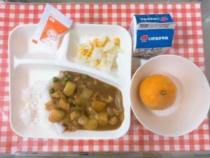 【チキンカレーライス[米粉]、キャベツとコーンのサラダ[ノンエッグドレッシング]、冷凍みかん、牛乳】
