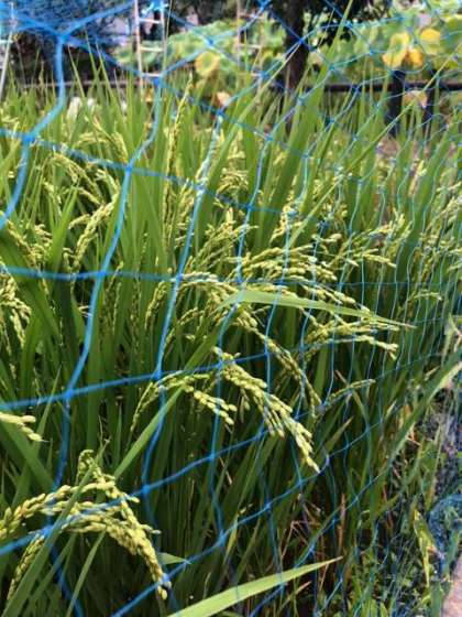 この時期はスズメにお米が狙われているので、月曜日に先生たちが力をあわせてネットを張りました。