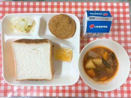 【チキンレバーカツ、ケチャップ煮、キャベツのバジル風味サラダ、食パン、マーマレード、牛乳】