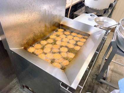 「チキンレバーカツ」は、カレー味がほんのりついて食べやすく、不足しがちな鉄をとることができます。茨田小学校では、フライヤーで揚げ物を揚げています。