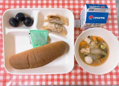 【あげぎょうざ、中華煮、ぶどう(巨峰)、黒糖パン、りんごジャム、牛乳】