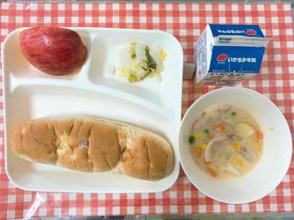 【コーンクリームシチュー[米粉]、はくさいのピクルス、りんご、おさつパン、牛乳】