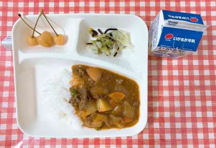【ハヤシライス[米粉]、キャベツのひじきドレッシング、さくらんぼ(缶)、牛乳】