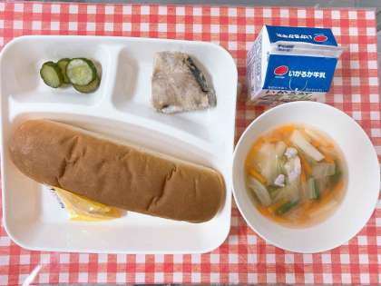 【かつおのマリネ焼き[ノンエッグドレッシング]、鶏肉とじゃがいものスープ、きゅうりのサラダ、コッペパン、アプリコットジャム、牛乳】