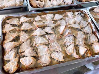「かつおのマリネ焼き」は、塩、こしょう、ノンエッグドレッシングで下味をつけたかつおを焼き物機で焼いています。1人1切れ(40g)を食べます。
