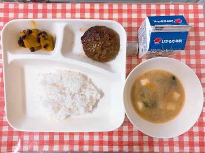 【和風ハンバーグ、とうふのみそ汁、かぼちゃのいとこ煮、ごはん、牛乳】