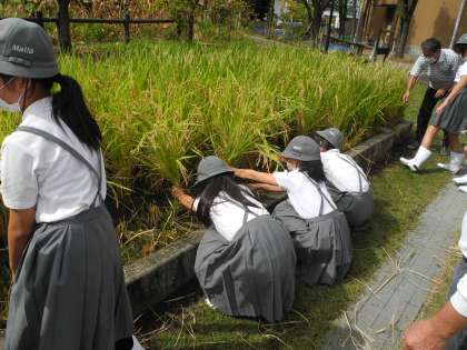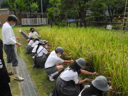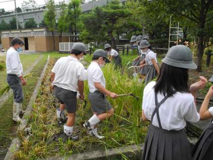 5年生は、稲刈りを体験しました。かまを使ってたくさんの稲を刈ることができました。
