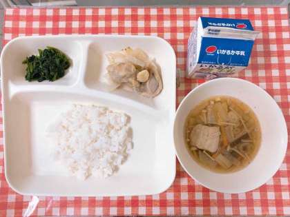 【鶏肉のゆず塩焼き、ソーキ汁、ほうれんそうのおひたし、ごはん、牛乳】