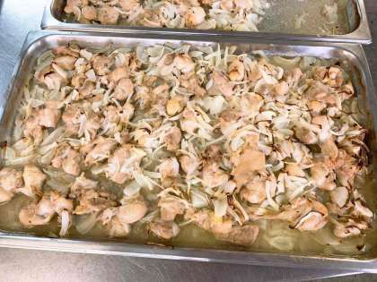 「鶏肉のゆず塩焼き」は、塩、ゆず果汁で下味をつけた鶏肉にたまねぎを混ぜ合わせ、焼き物機で焼いています。ゆずのさっぱりした味が、とてもおいしかったです。