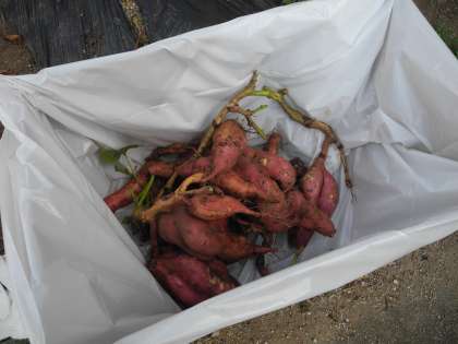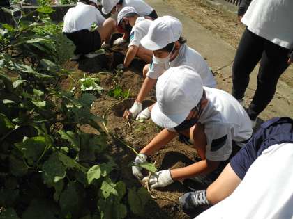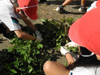 5月に植えた、サツマイモの収穫をしました。サツマイモは大きいものから小さいものもまで、子どもたちは、折れないように優しく土を掘ってサツマイモの収穫を楽しんでいました。収穫した後は、イモのつるを切って観察をしました。長いものは2m以上もあり、子どもたちも驚いていました。つるは乾燥させて、リース作りなどに使う予定です。時間があったので、隣の学習園で育てている落花生の収穫もさせてもらいました。