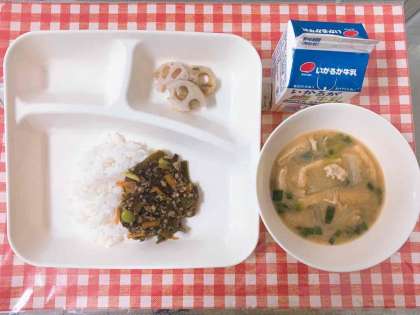 【もずくと豚ひき肉のジューシー、さつまいものみそ汁、焼きれんこん、牛乳】