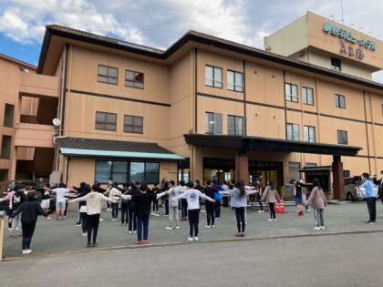 10月22日(金)。「おはようございます」。修学旅行2日目の朝を迎えました。朝の集いでは、本日の予定の確認とラジオ体操をしました。みんな元気です。