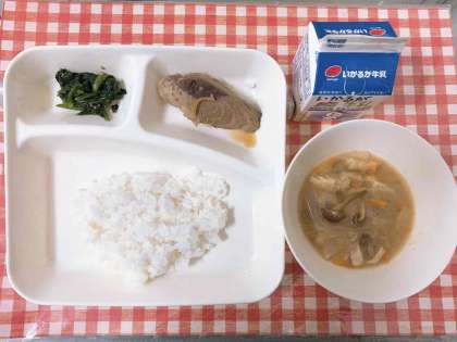 【なまりぶしのしょうが煮、なめこのみそ汁、ほうれんそうのごまあえ、ごはん、牛乳】