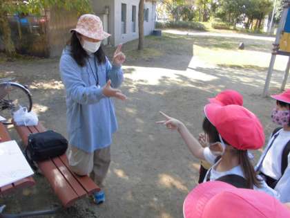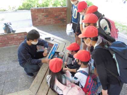 午前の活動は、学年縦割りのなかよし班に分かれて、鶴見緑地公園内をスタンプラリーをしながら活動しました。班長を中心に地図を片手に協力しながら、各ポイントのお題に参加し、点数を稼いていきます。また、出発から1時間50分以内にゴールするとボーナスポイントがもらえます。時間を気にしつつも、上級生が下級生を気にかけている姿も見られました。