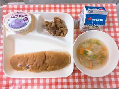 【豚肉のデミグラスソース、スープ、ぶどうゼリー、おさつパン、牛乳】