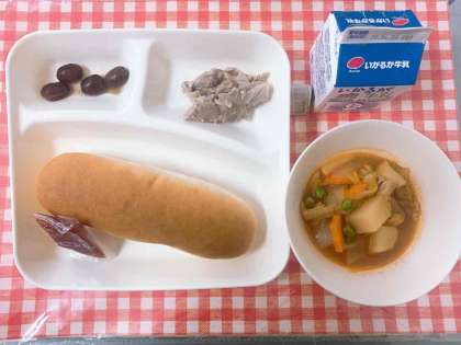 【豚肉のガーリック焼き、ケチャップ煮、うずら豆のグラッセ、コッペパン、いちごジャム、牛乳】