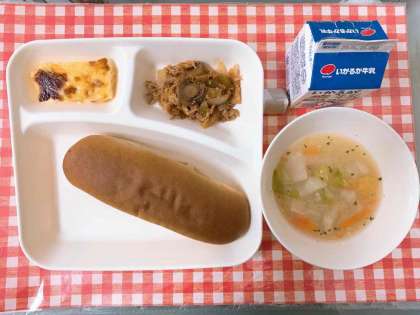 【豚肉のケチャップソテー、コーンスープ、焼きプリン、黒糖パン、牛乳】