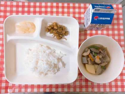 【鶏肉と野菜の煮もの、じゃこ豆、かぶのゆず風味、ごはん、牛乳】