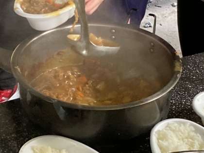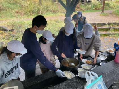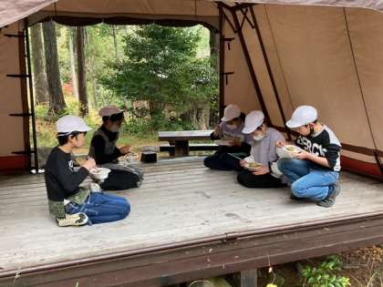 おいしいカレーができあがりました。班でそろって「いただきます!」