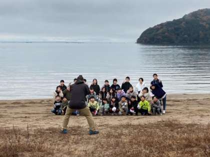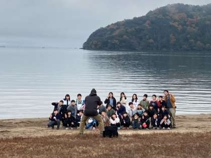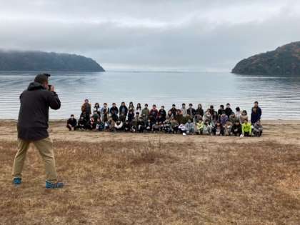 お天気が良くなったので、琵琶湖湖畔で記念写真を撮りました。クラスごとに撮影してから学年全体で撮りました。