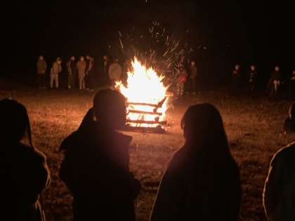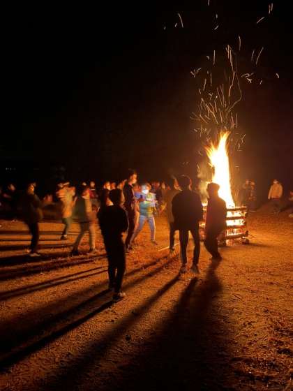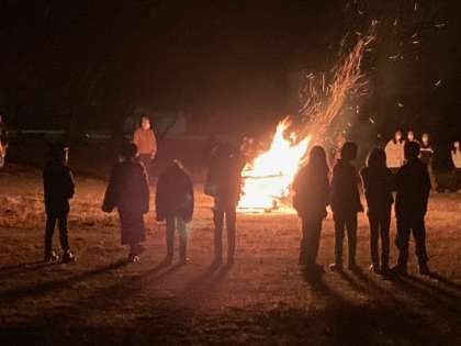 寒さも落ち着いていたので、湖畔でキャンプファイヤーを行いました。キャンプファイヤー係の進行で歌ったり、踊ったり、ゲームをしたりしました。大きな炎を囲んで楽しいひとときを過ごしました。